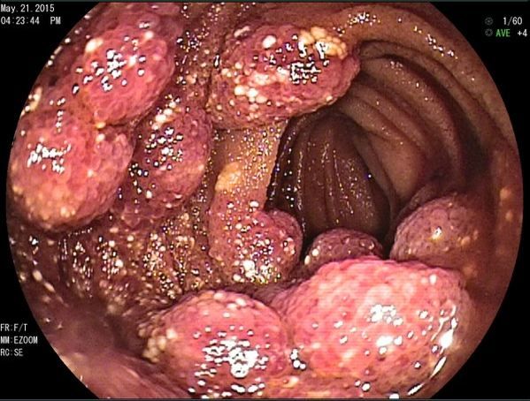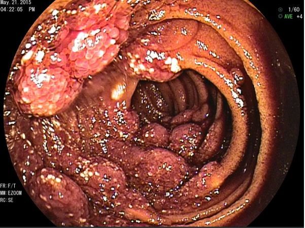 Figure 2. Mid-jejunum polypoid lesions with engorged, oozing villi seen on DBE.