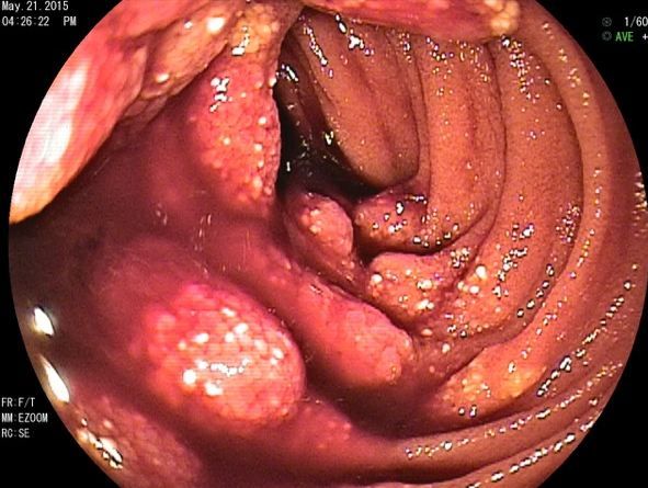 Figure 1. DBE image showing mid-jejunum polypoid lesions with engorged villi.