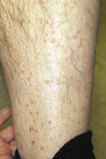 For several months, a 28-year-old man has had these changes to his nails, which have also become more brittle. He denies any history of trauma to the nails. When asked if he has any rashes, he lifts his pant leg, as shown here.