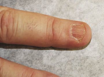 Biopsy of a lesion on the patient’s shin confirmed the diagnosis of lichen planus, A. This condition is associated with nail changes in up to 10% of affected patients. Among the changes seen with lichen planus are rough-textured nails with longitudinal ridging. Corticosteroids-either topical with occlusion or administered by injection-may help resolve these nail changes.