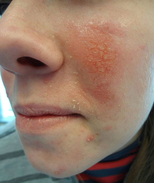 A 17-year-old girl presented with an “itchy rash”-circumscribed areas of swelling, erythema, oozing, and crusting-on both cheeks. Concerned about papulopustular acne, she applied an over-the-counter 5% benzoyl peroxide preparation.Twice-daily application of hydrocortisone 2.5% cream led to prompt resolution.