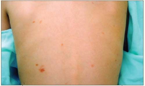 A 4-year-old boy presented with brownish patches on his torso and back that he had since early infancy and that decreased in size and number as he aged. The rash was intermittently pruritic. He had no systemic complaints. The parents denied any vomiting, failure to thrive, developmental concerns, or wheezing.