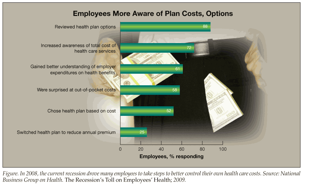 Employees are making changes to improve their health and better control their own health care costs in response to the current recession, according to results of a survey conducted for the National Business Group on Health (NBGH) by Fidelity Consulting Services. About 1500 workers aged 22 to 69 years at large companies (2000 or more employees) who were provided health care benefits through an employer- or union-sponsored health plan were interviewed in March.