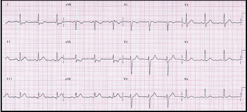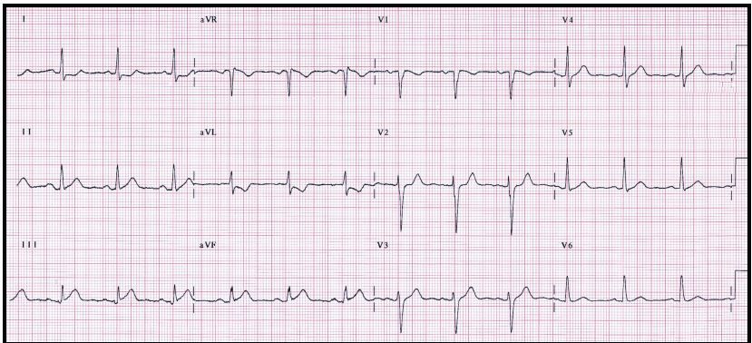 On examination, she was alert and oriented and in significant distress; significant diaphoresis was noted. Vital signs were: blood pressure, 105/64 mm Hg; pulse, approximately 70 beats/min; respiratory rate, 24 breaths/min; temperature of 37.4°C (99°F); and oxygen saturation of 92% on room air. The examination was otherwise normal. Results of a 12-lead ECG are seen in Figure 1.