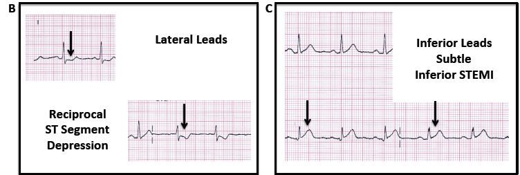 Reciprocal change is an important ECG concept to consider for two reasons. First, it identifies patients with a high-risk ACS presentation. Reciprocal change in the setting of STEMI identifies a patient with an increased likelihood of cardiovascular complication (heart block, malignant ventricular dysrhythmia, cardiogenic shock) and poor outcome (significant left ventricular dysfunction, death). Second, the presence of reciprocal change is strong confirmatory evidence that STEMI is present and has both very high specificity and a positive predictive value greater than 90%.1,2 With ECG presentations that are straightforward, reciprocal changes does not assist with ECG diagnosis; in more subtle presentations, such as seen in our patient (Figures 2A and 2C), reciprocal change (Figure 2B) can aid in making the ECG diagnosis.