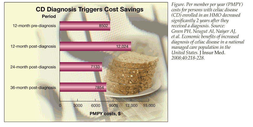 An increase in the rate of celiac disease (CD) diagnosis resulted in a significant reduction in direct medical costs and utilization of health care services, according to a team of researchers led by Peter H. R. Green, MD, professor of clinical medicine and director of the Celiac Disease Center, Columbia University College of Physicians and Surgeons, New York. CD occurs in genetically predisposed persons because of an immune response to gluten, the protein component of wheat, rye, and barley, and affects about 1% of the US population; however, CD goes undiagnosed in many persons. Study findings were published in the December 2008 issue of the Journal of Insurance Medicine.An increase in the rate of celiac disease (CD) diagnosis resulted in a significant reduction in direct medical costs and utilization of health care services, according to a team of researchers led by Peter H. R. Green, MD, professor of clinical medicine and director of the Celiac Disease Center, Columbia University College of Physicians and Surgeons, New York. CD occurs in genetically predisposed persons because of an immune response to gluten, the protein component of wheat, rye, and barley, and affects about 1% of the US population; however, CD goes undiagnosed in many persons. Study findings were published in the December 2008 issue of the Journal of Insurance Medicine.Using claims, encounter, and eligibility data of about 10.2 million enrollees in US managed care plans between January 1999 and December 2003, the researchers compared direct medical costs and use of selected health care services among 4 cohorts. The team identified 525 persons 62 years and younger who received a new diagnosis of CD, were continuously enrolled in the managed care health plan during the 12 months before diagnosis, and were not eligible for Medicare during the 3-year follow-up period. Three control groups were also identified: persons without a CD diagnosis but who exhibited 1 (cohort 1, N = 1109), 2 (cohort 2, N = 1038), or 3 or more (cohort 3, N = 980) systemic, GI, or nutritional manifestations of symptoms associated with CD.The researchers found that the direct medical costs of the CD-diagnosed cohort changed dramatically during the period. Overall, the mean medical cost per member per year (PMPY) increased from $8502 in the 12-month pre-diagnosis period to $12,024 in the 12-month post-diagnosis period, then decreased to $7133 and $7854 in the 24-month and 36-month post-diagnosis periods, respectively (Figure). The team attributed the rise in PMPY costs during the first post-diagnosis period primarily to an increase in facility inpatient care. The study authors suggested that a decline in facility inpatient and emergency department utilization resulted in the cost savings realized during the 24-month and 36-month post-diagnosis periods.