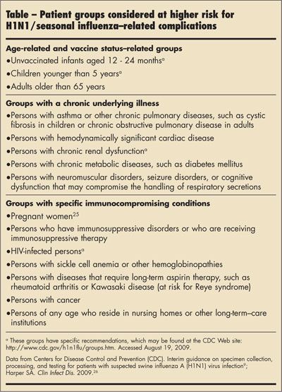 The most common reasons for admitting patients with H1N1 influenza have been lower respiratory tract infection and dehydration.15 Vulnerable groups-such as infants, children, pregnant women, the elderly, and immunocompromised persons-may have a lower threshold for being cared for in the hospital setting. However, with patients such as these, one might argue that efforts should be made to keep them in an outpatient setting, where they may be less likely to be exposed to drug-resistant organisms or to experience iatrogenic complications.