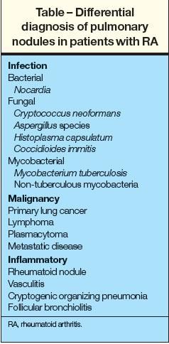 In patients with RA, nodules that do not regress should be evaluated in a manner similar to that for solitary or multiple pulmonary nodules in other patients (Figure 2). The differential diagnosis includes infection, malignancy, and other inflammatory disease (Table). In particular, fungal infection may be seen in patients who receive immunosuppressive agents to control their joint symptoms, and the reactivation of latent tuberculosis has been reported with the use of the newer anti–TNF-α agents.46