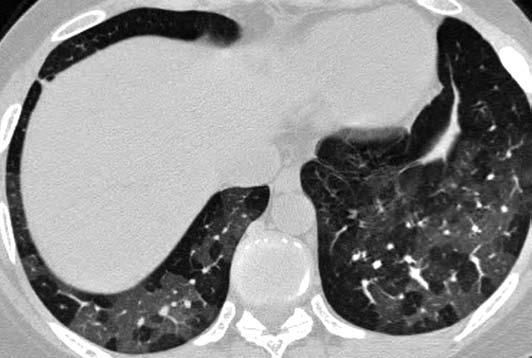 Figure 1 – Bronchiolitis obliterans developed in a 32-year-old woman with rheumatoid arthritis. Transverse high-resolution CT image shows heterogeneous/ mosaic lung attenuation with multifocal air trapping (demonstrated on expiratory images).