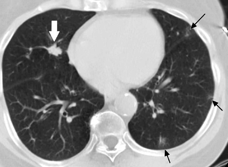 Figure 2 – A lung nodule was detected in a 63-year-old woman who had a long-standing history of rheumatoid arthritis and who presented with dry cough. Abnormal chest radiographic findings prompted a CT scan of the chest, which showed a 1-cm nodule with irregular margins in the right middle lobe (white arrow). Peripheral, patchy, ground-glass nodular densities consistent with underlying interstitial lung disease are also seen (black arrows). At surgery, a 1-cm squamous cell carcinoma, T1N0, was resected. The nonneoplastic lung revealed follicular bronchiolitis.
