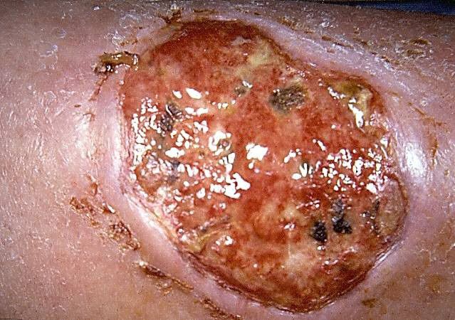 This solitary, rapidly expanding, very painful (analog scale 9 out of 10) ulcer developed on the pretibial surface of the leg of a 48-year-old woman with seropositive rheumatoid arthritis.