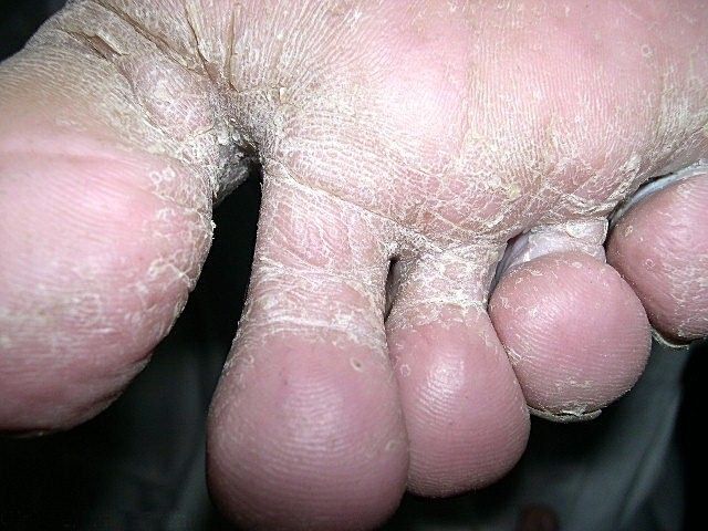 A 49-year-old man complained about mild itching and scaling on the foot, particularly at the base of the toes. His nails were intact.