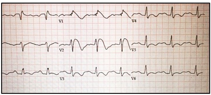 The Brugada pattern is NOT an interval-related ECG finding and typically includes down-sloping or saddleback morphology ST elevation in the anterior precordial leads V1-V3 that is often, but not always, associated with T-wave inversion and/or right bundle branch block. These findings can be intermittent. There are three different Brugada ECG patterns, shown in Figure 2. Patients with syncope and one of these ECG morphologies should have electrolytes and troponin evaluated and be admitted to a telemetry bed with cardiology consultation. Definitive treatment usually involves placement of an automatic implantable cardioverter-defibrillator (AICD).