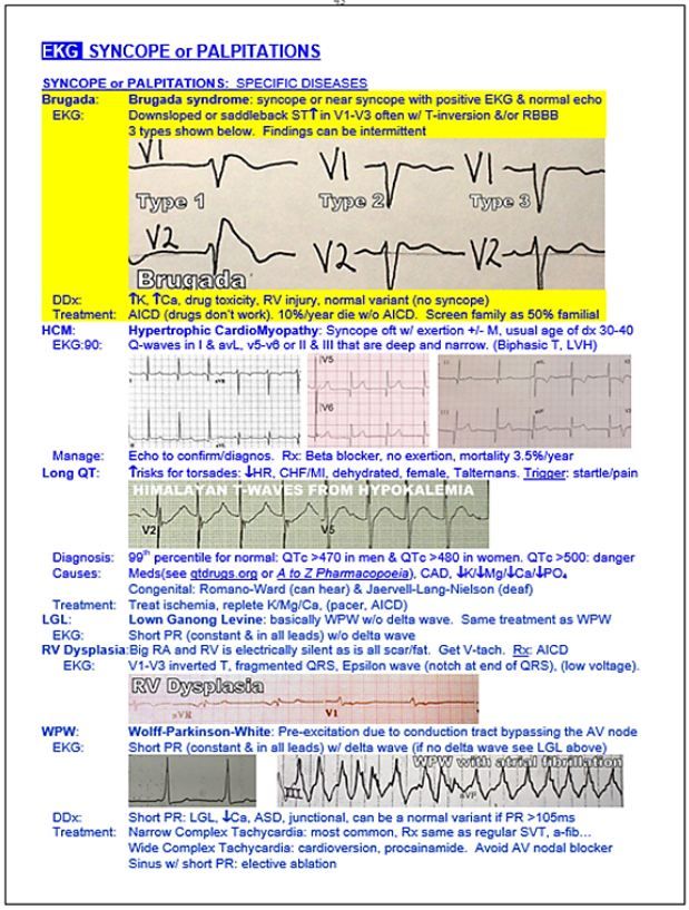 Testing for syncope should always include an ECG and orthostatic vital signs. If those are both normal and there are no additional symptoms or red flags on the history or exam, additional testing or treatment is rarely required. The page shot in Figure 2 (above) shows a number of ECG findings to check for in a patient with syncope when there is no evidence or more obvious findings such as tachycardia, bradycardia or ischemia. The most common of these ECG findings that signal a propensity for serious dysrhythmias are interval related findings, eg, long QT interval or short PR interval with Wolff Parkinson White syndrome and Lown Ganong Levine syndrome.