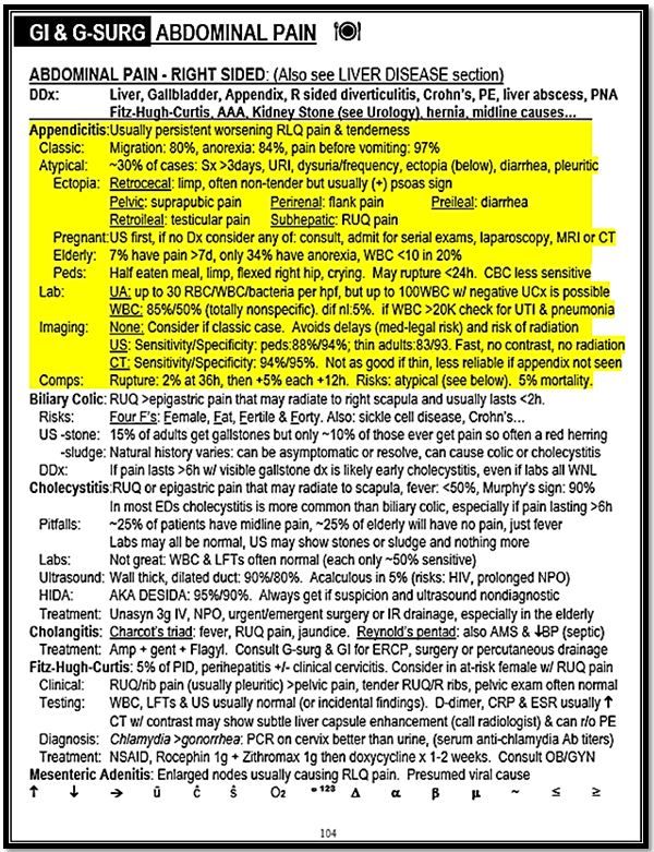 History: A 38-year-old woman presents to the emergency department complaining of 4 days of abdominal pain. She says the pain was initially generalized, but a day or two later localized to the right midabdomen, with occasional radiation to her low back and right hip. At that time she went to another hospital where she underwent a CT scan and abdominal ultrasound and lab work was performed. All results were normal except for evidence of a kidney infection for which she has been taking Cipro for the past 2-3 days.
