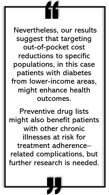 “Although we found that residents of lower-income areas with PDLs had a larger magnitude of reduction than counterparts residing in higher-income areas, effect estimates did not differ statistically,” the authors said. “Nevertheless, our results suggest that targeting out-of-pocket cost reductions to specific populations, in this case patients with diabetes from lower-income areas, might enhance health outcomes. Preventive drug lists might also benefit patients with other chronic illnesses at risk for treatment adherence–related complications, but further research is needed.”