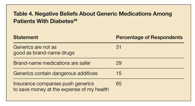Results of the Flint Study showed that diabetic patients also have negative beliefs about generic medications. In this study, almost 800 diabetic patients from an economically distressed region were surveyed. Table 4 shows the results of this study in regard to generic medications.27 Misconception about generic drugs can lead to medication underuse, which, in turn, results in poor health outcomes. This would negate the cost saving benefit of generic medications. Physicians and diabetes educators have the ability to address patients’ concerns and provide reliable information about generic medications. Insurers should assist health care providers in promoting adherence to therapy with generic medications.