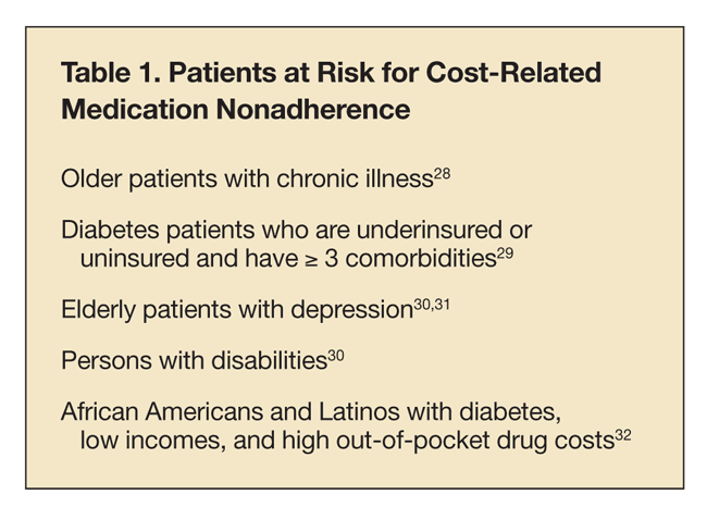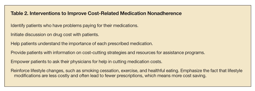 Several studies suggest that patients are selective about the medications they forgo. Patients with different clinical characteristics and socioeconomic backgrounds respond to medication cost problems differently. Table 1 lists the patients at greatest risk for cost-related medication nonadherence. Interventions to improve cost-related medication nonadherence are described in Table 2.