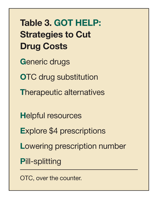 Once cost-related medication nonadherence is identified, health care providers should take steps to make sure their patients get the medications they need. There are multiple cost-cutting strategies available, which may be remembered using the acronym GOT HELP (Table 3).