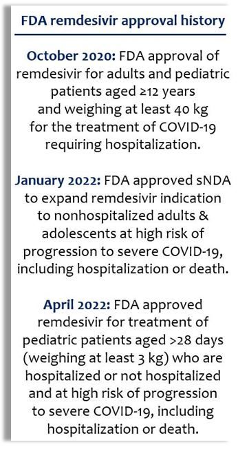 Original approval of remdesivir in October 2020 was to treat adults and pediatric patients (12 years of age and older weighing at least 40 kilograms) with COVID-19 requiring hospitalization, according to the FDA. (see sidebar)