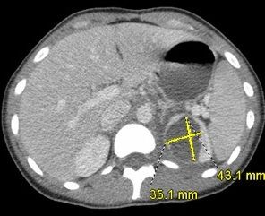 A 3.5 x 4-cm cyst in the upper pole of the left kidney was detected by renal ultrasonography. This raised concern for a possible renal abscess, given the patient’s clinical picture. A CT scan of the abdomen/pelvis with contrast revealed a left renal abscess (43.1 x 35.1 cm2) (Figure).
