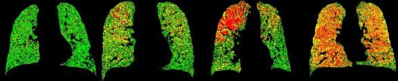 Parametric response mapping, used to analyze lung CT scans, helps physicians distinguish between early-stage airway damage and emphysema. In lung images of a healthy person, 2 persons with mild to moderate chronic obstructive pulmonary disease, and one with severe emphysema (left to right), green is healthy tissue, yellow is small airway damage, and red is more severe damage.