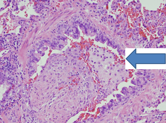 An open lung biopsy performed 5 days after a previously healthy young man with hemoptysis was intubated showed bronchiolitis obliterans organizing pneumonia, characterized by granulation tissue in the bronchiolar lumen, alveolar ducts, and some alveoli. Chest radiographs typically show bilateral patchy alveolar infiltrates and nodules. Lung biopsy via video-assisted thoracoscopic surgery is preferred for diagnosis.