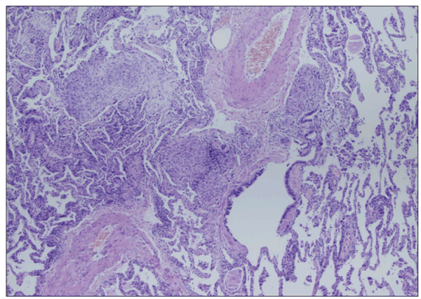 Drug-induced hypersensitivity pneumonitis is a clinically distinct pulmonary syndrome characterized by a complex immunological reaction. This lung biopsy specimen shows loosely formed granulomas near the terminal bronchioles and lymphocytic and plasma cell infiltration of the alveolar walls. Chronic interstitial pneumonia, loose granulomas, and areas of organizing pneumonia are consistent with hypersensitivity pneumonitis.