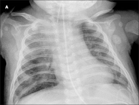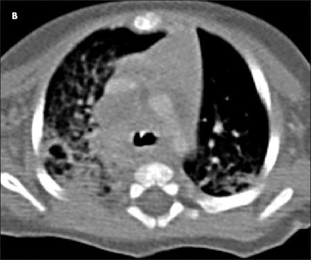 A chest radiograph from a baby girl with a history of difficulty in breathing showed a hyperinflated right lung with a shift of the mediastinal contents into the left hemithorax (A). A chest CT scan showed diffuse mediastinal and right hilar adenopathy (B). The case emphasizes the difficulty in diagnosing pulmonary tuberculosis in an infant with a nonspecific presentation and no travel or contact history.