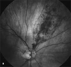 A 70-year-old woman reported that she could see only parts of things and that her vision was blurred in her left eye. She described her vision as “a puzzle with pieces missing.” She had no eye pain but did see floaters in her left eye. She also felt she could see an afterimage of light in her left eye even after the room lights were turned off. The light appeared “like a flash lingering for several minutes.”