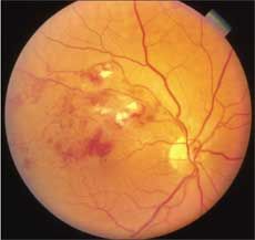 A 76-year-old man presented for an annual eye examination; his only complaint was that he had some difficulty in reading fine print. He was pseudophakic in both eyes. He had hypertension, hyperlipidemia, type 2 diabetes mellitus, and moderate obesity.