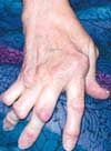 By the time the patient saw the rheumatologist, she was in considerable pain. Swelling, redness, and warmth were present bilaterally in the PIP, MCP, and MTP joints as well as in both wrists. Morning stiffness had increased to 2 hours. Plain radiographs revealed soft tissue swelling of both hands, accompanied by periarticular osteopenia in some MCP joints. Laboratory studies revealed positive RF and cyclic citrullinated peptide (anti-CCP) antibodies, decreased hemoglobin, and an elevated ESR. With these new findings, a definitive diagnosis of rheumatoid arthritis (RA) was made that satisfied the American College of Rheumatology (ACR) criteria.
