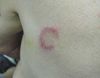 At follow-up 4 days later, the lesions had multiplied and enlarged to about 2 cm; they lacked a central clearing. Daily application of ketoconazole cream was prescribed; the therapy was discontinued when the results of a potassium hydroxide preparation and fungus culture revealed no hyphae.