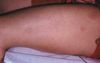 A healthy 9-year-old boy presented with round, pink, slightly raised, nonpruritic lesions on the legs of several days' duration. The lesions had arisen as papules that resembled mosquito bites and had gradually enlarged. Cellulitis was suspected, and oral cephalexin was prescribed.