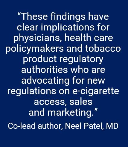 “These findings have clear implications for physicians, health care policymakers and tobacco product regulatory authorities who are advocating for new regulations on e-cigarette access, sales and marketing,” said co-lead author, Neel Patel, MD, a research scholar in the department of public health at the Icahn School of Medicine at Mount Sinai in New York City. “People need to be warned that e-cigarettes should not be promoted as an alternative option to smoking traditional, combustible cigarettes.”
