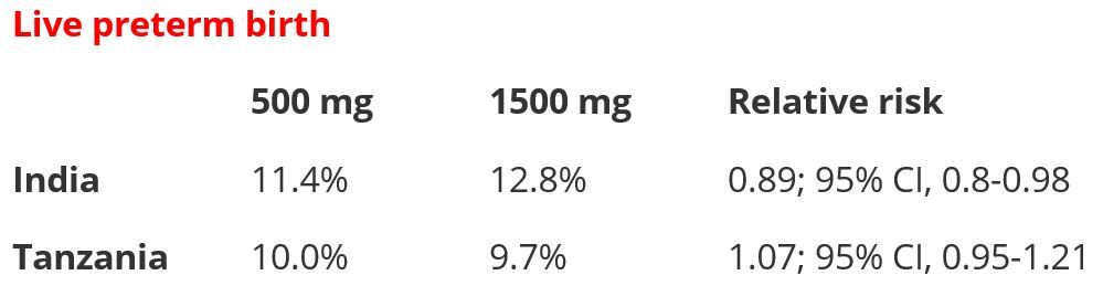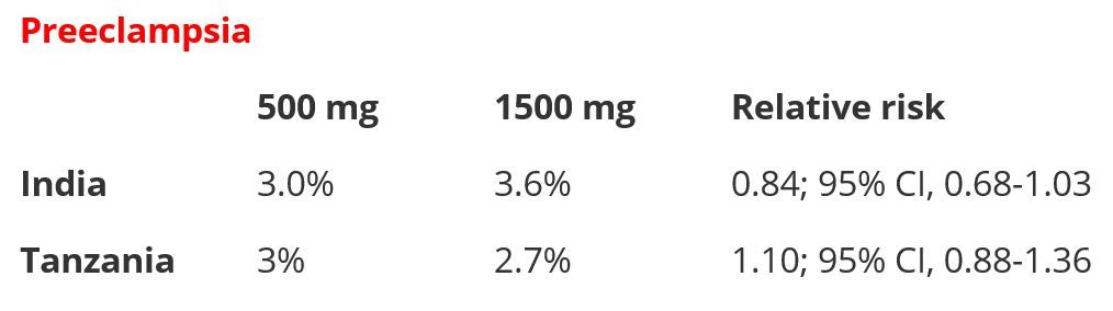 In 2 studies of 11 000 nulliparous pregnant women, 1 in each country, investigators found that the cumulative incidence of preeclampsia in the Indian arm for the 500 mg group was 3% and percentage of live preterm births (before 37 weeks of gestation) was 11.4%.1In this study preeclampsia incidence among women in the 1500 mg group was 3.6% and proportion of live preterm births, 12.8%, demonstrating noninferiority of the lower vs the higher dose for both outcomes.1