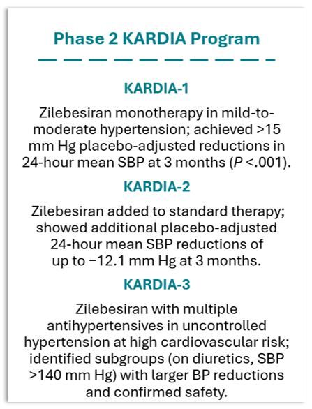 This next step in the investigation of zilebesiran follows analysis of data from the phase 2 KARDIA program, including KARDIA-1, KARDIA-2, and KARDIA-3, which studied zilebesiran in participants with uncontrolled hypertension and high cardiovascular risk on background treatment with 2 to 4 antihypertensive agents.