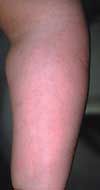 Pruritic red patches have developed on the trunk and extremities of a 25-year-old woman following her first session at a tanning salon after a hiatus of several months. She had previously visited the salon on several occasions, with no ill effects. Treatment with an over-the-counter hydrocortisone cream has been ineffective. The patient takes no medication other than an oral contraceptive.