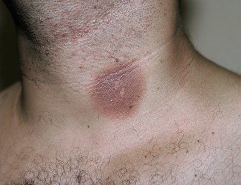Five days after a 41-year-old man started taking a new medication, this superficial but painful lesion appeared on his neck. It slowly resolved after the drug was stopped and a topical corticosteroid was applied twice daily.