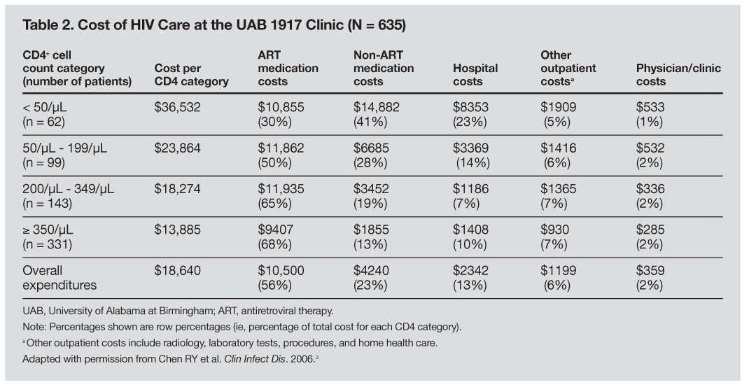 In 2006, a study done at the UAB 1917 Clinic evaluated the reimbursement for care at its Ryan White–funded clinic.3 In that study, the overall cost of care for an HIV-infected patient was $18,640 per year (Table 2). As expected, expenditures were dramatically higher for those with more advanced disease ($36,532/patient/y) than for those with early infection ($13,885/patient/y). Regardless of stage of disease, over 75% of the reimbursed cost of care is for medication expenditures (antiretroviral and non-antiretroviral medication costs), 13% for hospitalizations, and 6% for laboratory and ancillary tests. Less than 2% of all expenditures ($359/patient/y) are allocated to cover the costs of clinics through third-party payers. The way the 1917 Clinic and most other HIV clinics survive, therefore, is through support from the Ryan White funds.