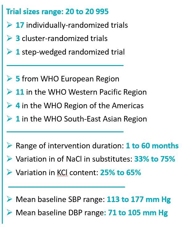 The search returned 21 trials (N=31 939) of which 19 reported effects on blood pressure and 5 reported effects on clinical outcomes. To define the consistency of the different findings across trials, location, and patient subgroups, Neal et al report using meta-analyses and meta-regressions.