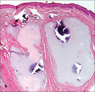 Examination of a biopsy specimen stained with hematoxylin and eosin (H & E) revealed several dilated epidermal cysts (B). These cysts exhibited calcification of their keratin contents, with little evidence of active inflammation. The calcified material stained deeply basophilic with H & E. Some cysts showed rupture of their epithelial walls surrounded by a fibrous capsule.