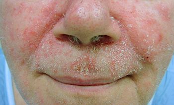 Key point: The eruption does not actually follow the malar area (across the zygoma), but instead goes down the nasolabial folds and also involves the moustache area. There is abundant thick, greasy scale present. This is a classic picture of seborrheic dermatitis, albeit fairly severe.