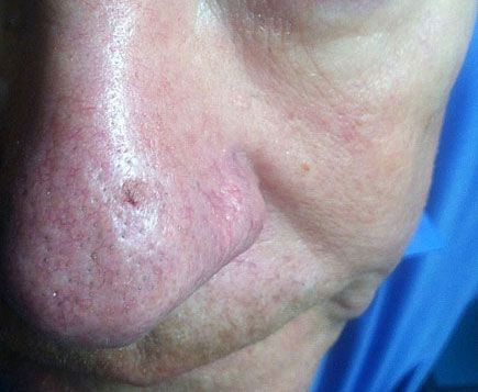 A 69-year-old man complained about an asymptomatic “spot” on his nose that had been present for at least 3 months. His past medical history included innumerable facial actinic keratoses.