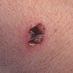 Half way through a 15-minute iontophoresis treatment for de Quervain tenosynovitis of the right wrist, a 42-year-old woman felt exquisite pain but completed the session. After the therapist returned to the room and removed the electrodes, a light gray circular mark about 5 mm in diameter was noted on the skin. The epidermis was gone, and the underlying dermis was also injured. Within 6 hours, a tender, dark red-brown lesion developed.