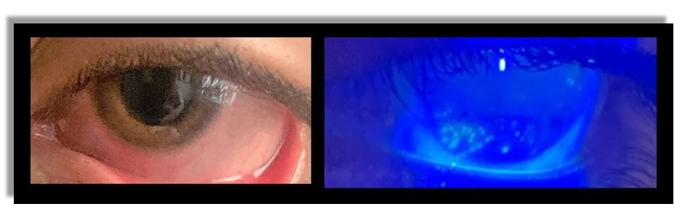 Vital signs are normal. Physical exam is otherwise normal except for images shown below. Intraocular pressure is 12 mm Hg in each eye (normal <21 mm Hg).