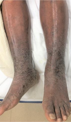 Patient history: A 62-year-old man presents to the emergency department (ED) for a rash. He has been using over-the-counter topical medications for possible fungal and possible bacterial infection in his legs for about 10 days but feels as though the condition is getting worse. He is having itching and scaling but no fever or pain except in his bilateral ankles where skin cracking is most prominent and there is some weeping. He has never had this before. He denies other complaints.