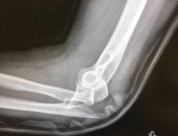 Vital signs & physical examination. Vital signs are normal. Physical exam is otherwise normal except for tenderness and swelling to the elbow. His distal neurovascular exam is intact