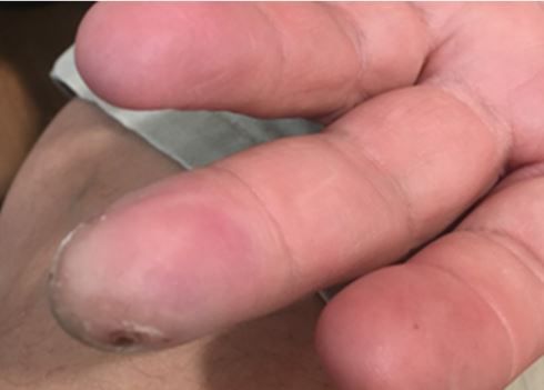 Vital signs & physical examination. Vital signs are normal. Physical exam is notable for “nail-bitten” fingernails and a firm fingertip on the left middle finger with some small scabs. See image below.