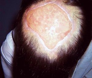 A 60-year-old man presents with a 11/2-year history of an expanding lesion on the scalp. He has seen several other health care providers, none of whom have been able to provide any effective therapy.